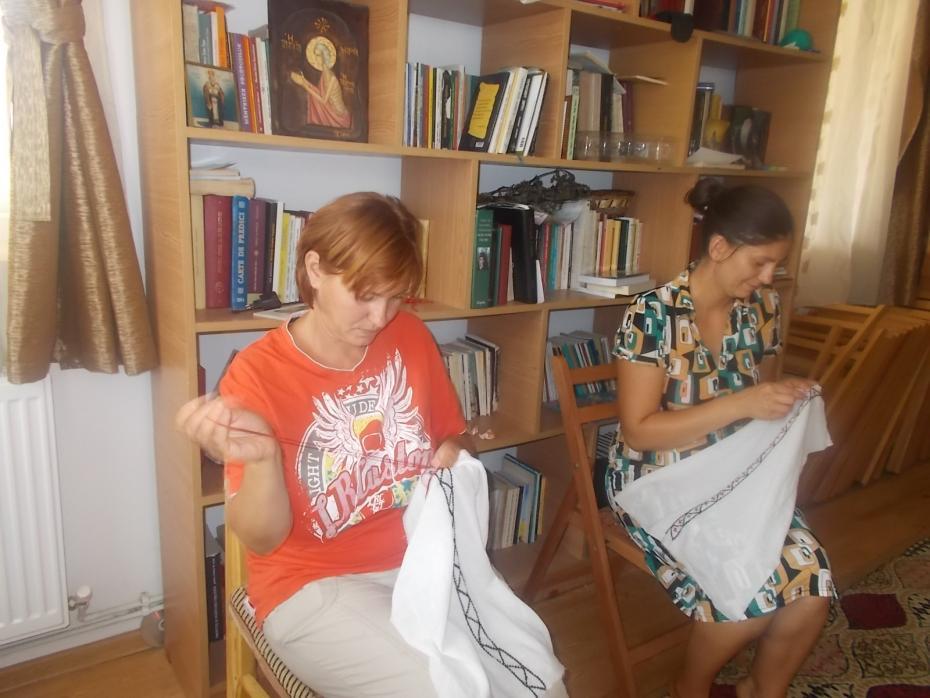 Încă de data trecută, 8 August, și astăzi, 14 August, am început să coasem pe ie. Am stabilit modelul și am început de la mâneca iei. Deoarece materialul este des nu se pot număra firele, astfel cu ajutorul unei rigle și a unui pix putem să ne ducem treaba la bun sfârșit. Tind să precizez că doamnele și tânăra care participă nu știau să coase în cruciulițe. Am chemat pe doamna Otilia Simotă, din sat, care are experiență și a cusut mult când era mai tânără, și ne-a învățat pașii. Îi mulțumim pe această cale și Dumnezeu să-i dea sănătate. Am pornit cu optimism, curaj și încredere în Maica Domnului că ne va ajuta să ducem la capăt ceea ce ne-am propus, să coasem cele 29 de ii. Nimic nu este imposibil, trebuie doar să încerci, iar dacă este voia Domnului se duce la bun sfârșit.